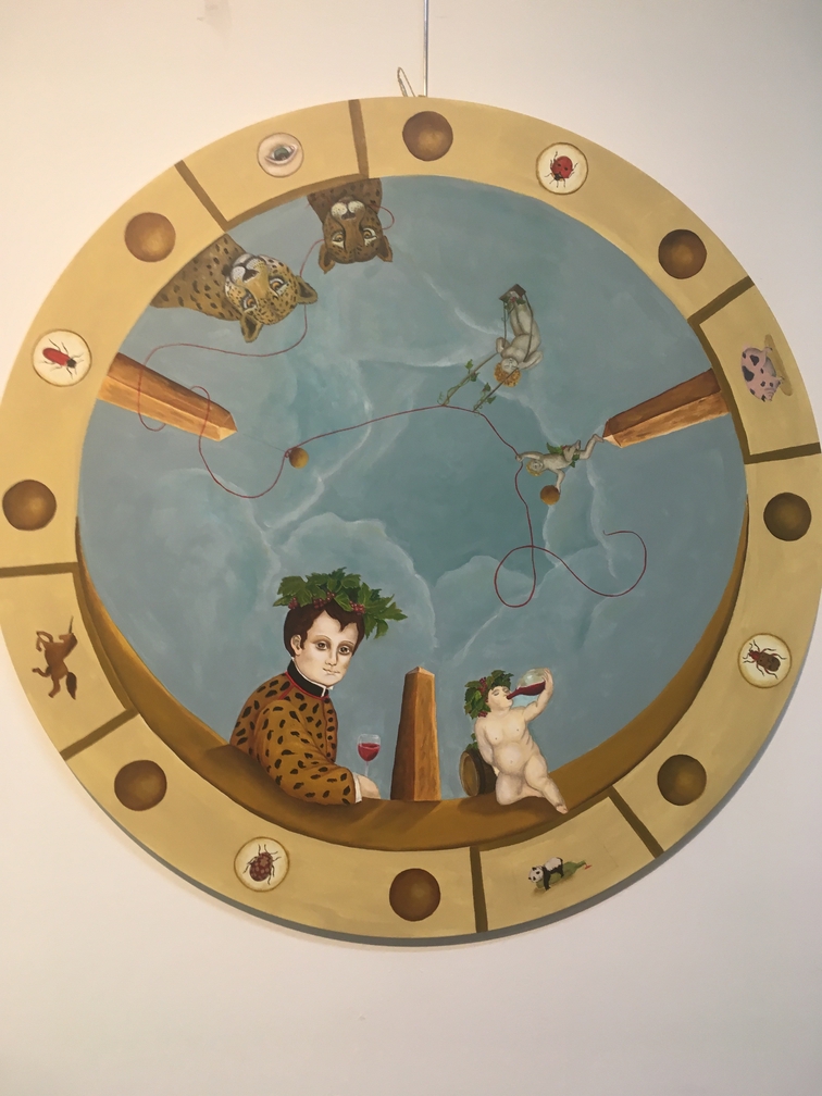 Een groot rond schilderij over Ariadne die haar geliefde uit de doolhof redt door hem het uiteinde van haar rode kluwen wol mee te geven, reikt het thema van de kunstvesper aan: de rode draad.