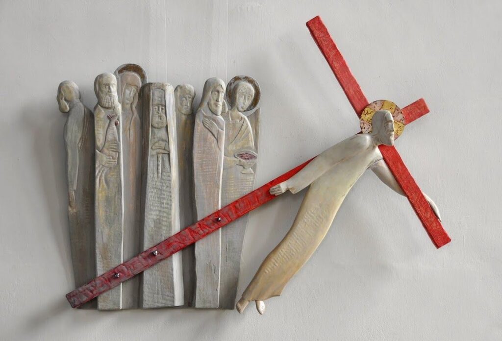 We zien een groep mensen. Een groep omstanders lijkt het. En we zien Jezus zijn kruis dragen. Met drie bouten zijn ze aan elkaar vastgeklonken: de omstanders en de man onder het kruis. Maar tegelijk lijkt er een grote afstand tussen de groep en die ene. Alsof ze getuige zijn van iets wat hun bevattingsvermogen te boven gaat, van iets waarmee ze vooralsnog geen verbinding kunnen maken.