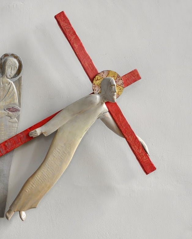 De man onder het kruis gaat niet onder het gewicht van het kruis gebogen, zoals in de klassieke staties uit de kruiswegtraditie, waarin hij tot driemaal toe onder het kruis valt. Hij lijkt veeleer te zweven, de voeten los van de grond. Alsof hij aan de groep voorbijgaat en hen vooruit is.