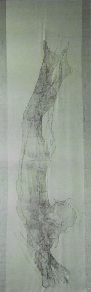 Het kunstwerk is een stuk linnen dat vrij in de ruimte hangt en door een ademtocht in beweging gebracht wordt. Een menselijke gestalte is uit het linnen weggehaald: met fragiel verbandgaas, gekleurd door vezels van wol en zijde, en met gestikte stippellijnen wordt een intiem binnenste blootgelegd, een gebaarsilhouet van schaduw en licht.